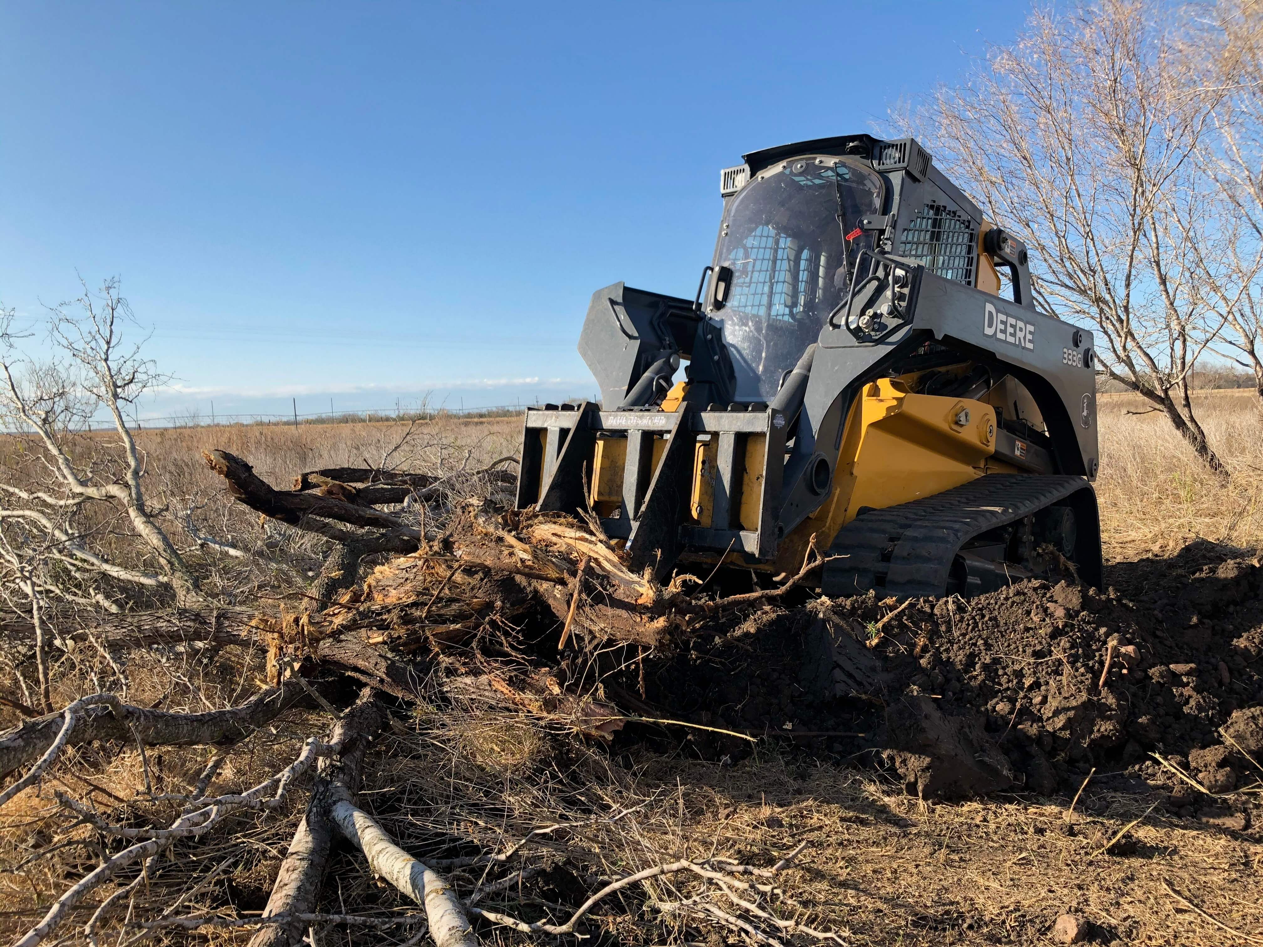 Grubbing is a meticulous mechanical practice where the individual plant is completely removed from the soil, roots included. It is unique in that no follow up treatment is required for regrowth suppression of the individual plants removed. When grubbing, we utilize skid steers, excavators, or bulldozers with specific attachments to completely uproot the plant from the soil. Species conducive to this practice include but are not limited to Mesquite, Huisache, Cedar/Juniper, Retama, Elm, and Sweet Gum.